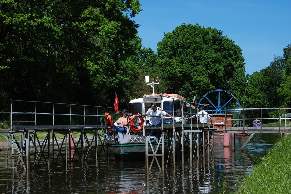 Tymczasem w kanale słychać gong. Maszynista wprawia w ruch koło wodne o ukośnych kieszeniach, każda trzy tony wody mieści i obraca to koło, dopóki woda się nie wyleje. Kieszenie na całym obwodzie koła się znajdują. Koło przez przekładnie napędza bęben. Bęben maszyny wyciągowej równocześnie nawija i rozwija grubą linę stalową. Lina przez koła zwrotne wciąga wózek. Wózki są dwa z sobą tą liną połączone. Jeden w górę, drugi w dół się toczy. Jedna lina się nawija, druga rozwija się równocześnie. Wózek ze statkiem pokonuje grzbiet i do wody wjeżdża na tyle głęboko, że statek ponownie na wodzie się unosi, by odcumować i płynąć dalej. Maszynista zmienia kierunek obrotu bębna. Platforma z góry w dół podąża, ta z dołu zaś – do góry. Kolejny statek płynie po trawie. Frytki są smaczne, ciepłe i syte. Dla kolejnych klientów już braknie. Tyle osób tego dnia pochylnie Buczyniec odwiedziło. Jest ciepły, słoneczny dzień, już wieczór niemal. W izbie pamięci oglądamy film. Chłodno i przyjemnie tutaj, inaczej niż na zewnątrz. Starszy słucha o Krzyżakach, Kanale Oberlandzkim, inżynierze Steenke; sosnach taborskich, które skarbem tych ziem były i niejednym masztem się stały. Młodsza śpi w chłodzie. Słońce i świeże powietrze potrafią zmęczyć.