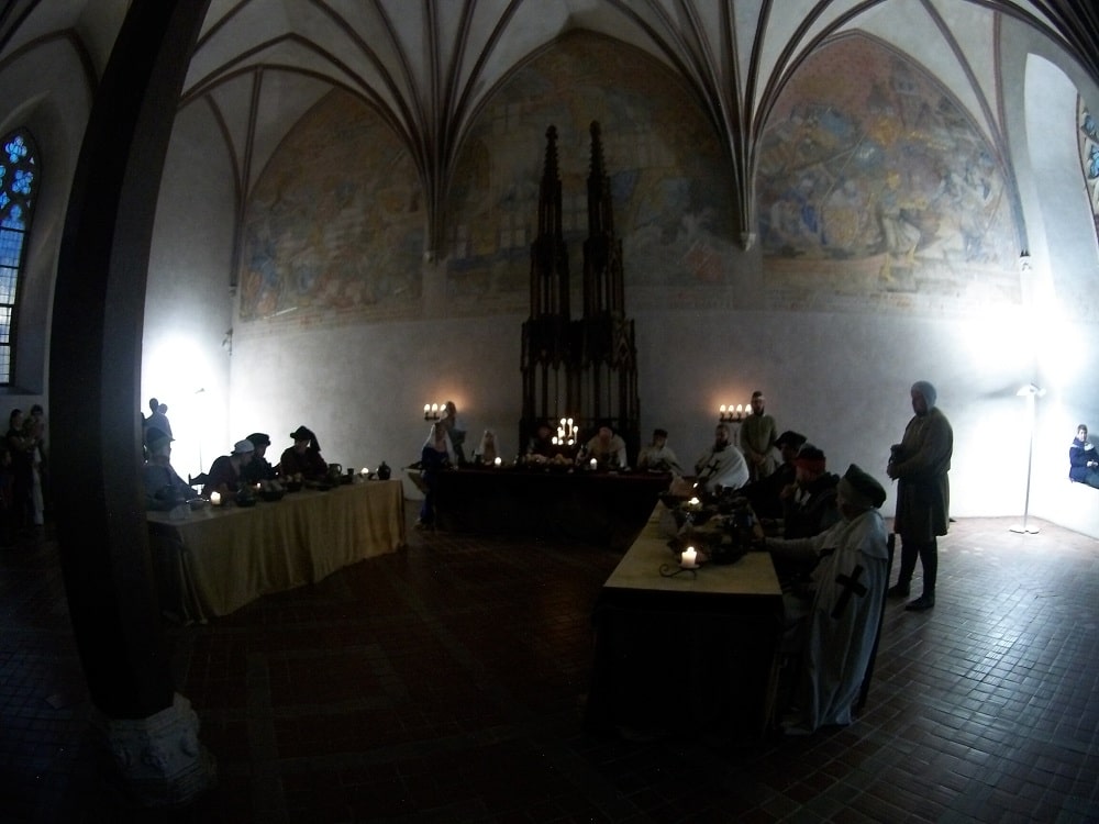 Średni zamek był miejscem gościnnym. Spraszano tu rycerstwo całej średniowiecznej Europy, goszczono władców. Ogrom i przepych, jaki towarzyszył przyjmowaniu gości, wpajał przekonanie o potędze zakonu, który naprawdę był potężny i chciał, by sąsiedzi o tym wiedzieli. Wielki Refektarz – wielka sala wsparta na trzech filarach – był świadkiem niejednego ówczesnego spotkania. I dzisiaj wypełnił się muzyką. Występy z flagami i żonglerką ogniem nie pozwalają pozostać obojętnym nikomu. Niepotrzebne słowa przewodniczki objaśniają, jak tu kiedyś być mogło, a to się dzieje właśnie teraz. Po co w czasie spektaklu opowiadać historię teatru? Do stołu nas nie proszono, jednak dzieciom takich zaproszeń nie trzeba. Chłopiec niewielki podszedł do stołu i dotknął jadła.