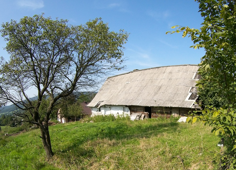 Pojawiały się grzyby, a trzeba wam wiedzieć, że te potrafią pokrzyżować wszystkie plany. Maślak, koźlak, zajączek dołączyły do naszego grzybowego zbioru. Dwie panie z koszami pełnymi, odpoczynku zażywały, by po chwili znów ciężkie grzybowe tobołki targać. Czerwone kreski wyprowadziły nas z lasu. Łąkami w dół schodziliśmy, by napotkać fundamenty starych domów. By napotkać dacze nowopowstałe tych, których stać było na zagospodarowanie sobie odludnego zakątka. By napotkać dom drewniany z płotem obalonym. Zarośnięty był zielem wysokości chłopa, cały wraz z zabudowaniami gospodarczymi. Kiedy w nim tętniło życie? Jakiego dnia i kto tam ostatnią potrawę upichcił? Tego już się nie dowiem.