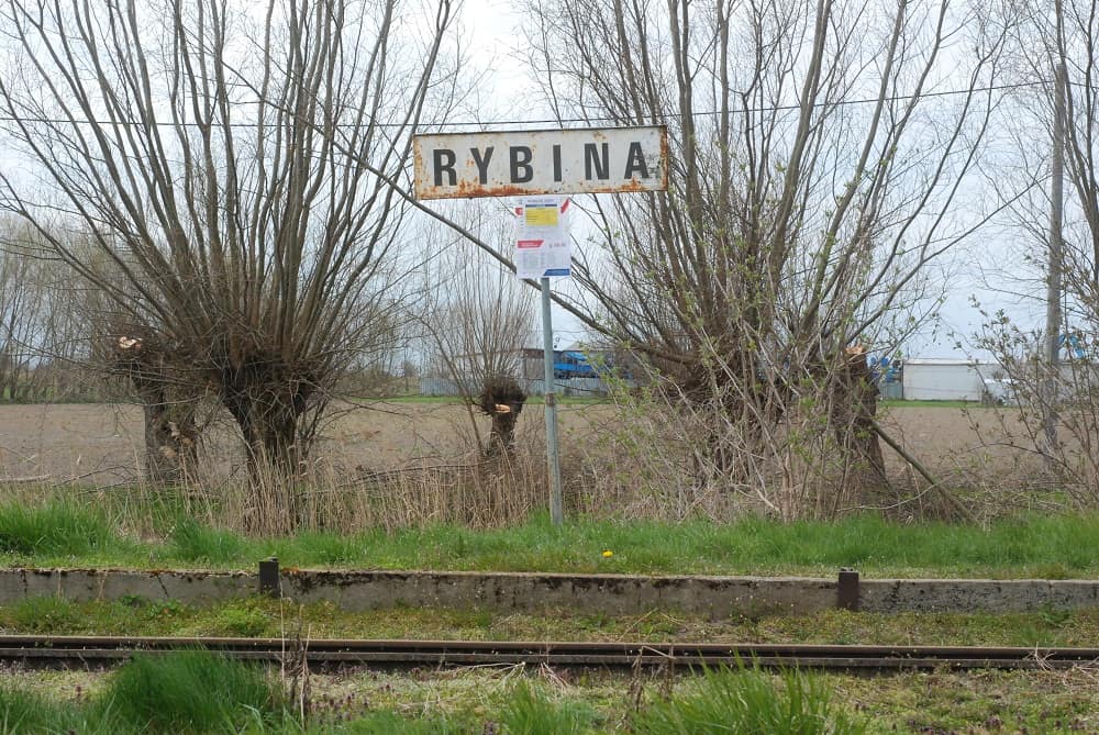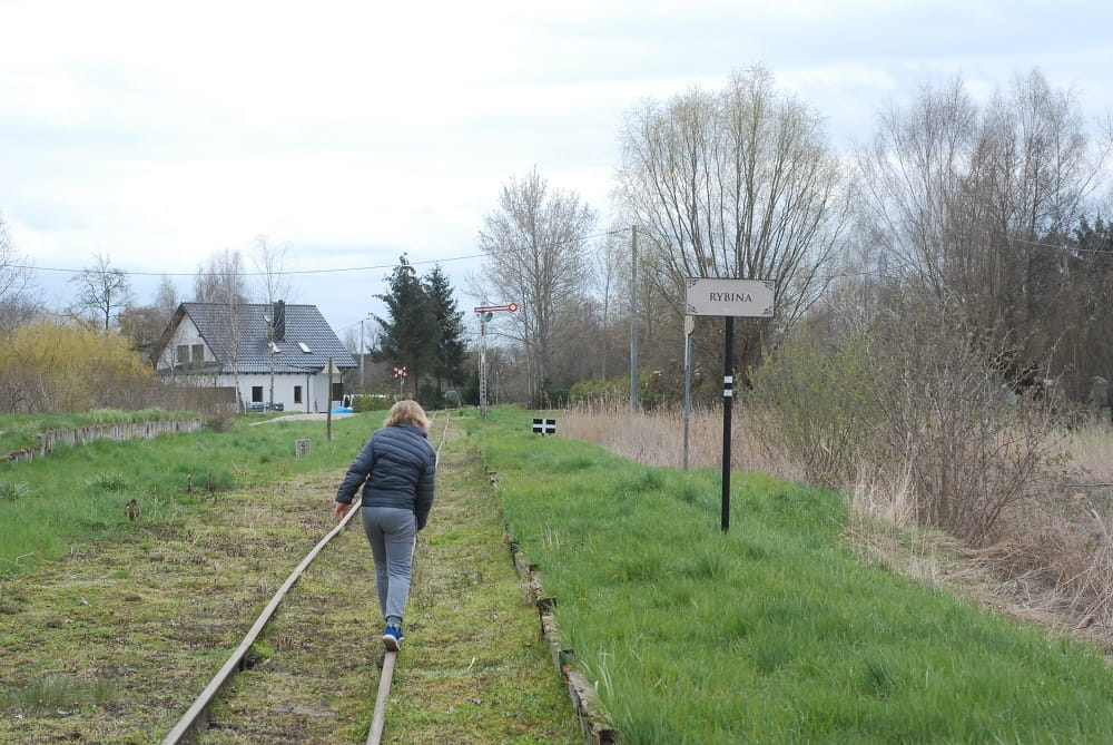 Jaś uratował bąka i to chyba było niezwykłe, bo zajęło nam bardzo dużo czasu, obserwowaliśmy, jak siadał na kwiatkach, potem odlatywał. Dalej był napis „Rybina”, taki samotny stał przy torach.