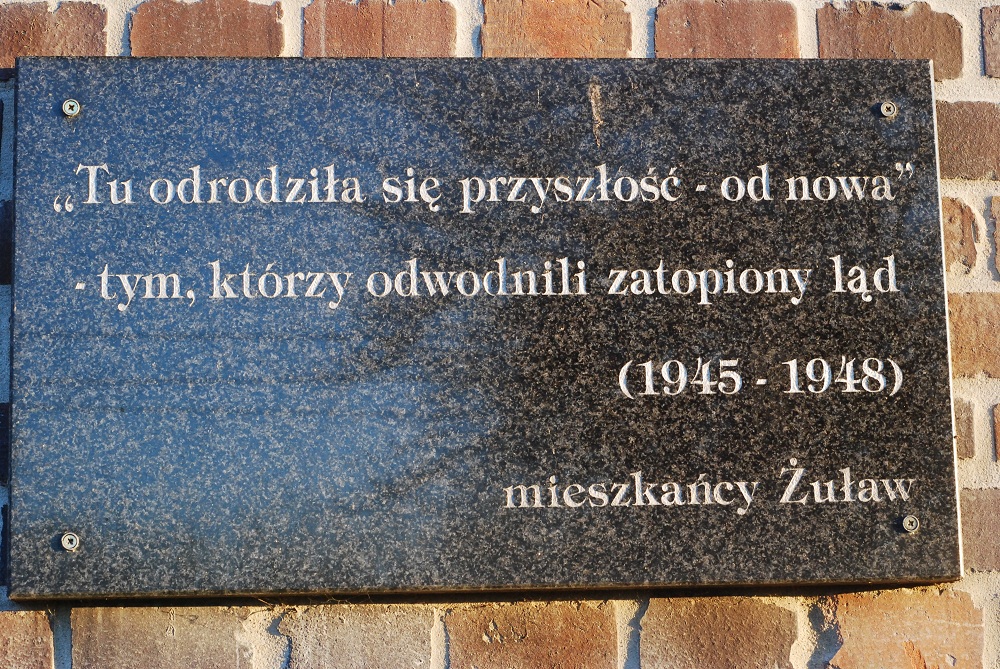 Mnie natomiast rysują się tragedie ludzi, którzy patrzyli, jak dorobek ich życia znika pod wodą. Ludzi, którzy zmuszeni byli do wyjazdu bez wizji powrotu, bo to już nie ich ziemia, nie ich pola i domy. Nie jest mi ich żal. Może dlatego, że innym językiem mówili, a może dlatego, że ich osiedlenie też wiązało się z wysiedleniami. Ich następcy w dużej mierze przeniesieni z kresów wschodnich też zaczynali wszystko od nowa, nowi i starzy Polacy budowali swoją krainę, która wtedy wcale nie była turystyczną. Ogromne tereny, aż po Tczew i Malbork, zostały zalane wodą, a ich odwodnienie trwało do połowy lat pięćdziesiątych. Wielu przesiedleńców ruszyło gdzie indziej szukać swojego miejsca, ci, co pozostali, „odradzali przyszłość – od nowa” jak głosi napis na tablicy ceglanego budynku przepompowni w Chłodniewie.