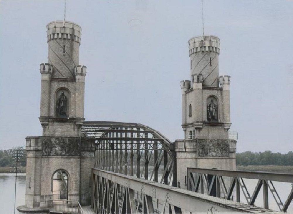 Most kolejowy jest najstarszą istniejącą przeprawą w Toruniu. Pierwotnie był przystosowany do ruchu kołowego i pieszego. Baszty z obu stron przyczółków zdobione były czterema figurami wysokości 2,8 m każda. Figurami mistrzów krzyżackich na brzegu pomorskim (prawym) i władców Niemiec na lewym brzegu kujawskim. Pod postaciami znajdowały się płaskorzeźby z krzyżackiej i pruskiej przeszłości Torunia. W wieżyczkach tych znajdowało się pomieszczenie dla wartowników mostowych oraz komory minowe, do których prowadziło zejście w dół filaru, na wypadek potrzeby wysadzenia mostu. Jak się zapewne domyślacie, most powstał na ziemiach wtedy niemieckich. Przepływaliśmy pod nim na ziemiach polskich. Dzisiaj nie ma już posągów, płaskorzeźb, wieże zmalały i nie sławią już tamtej historii. Most był dwukrotnie wysadzany. Czy wykorzystano do tego komory minowe?